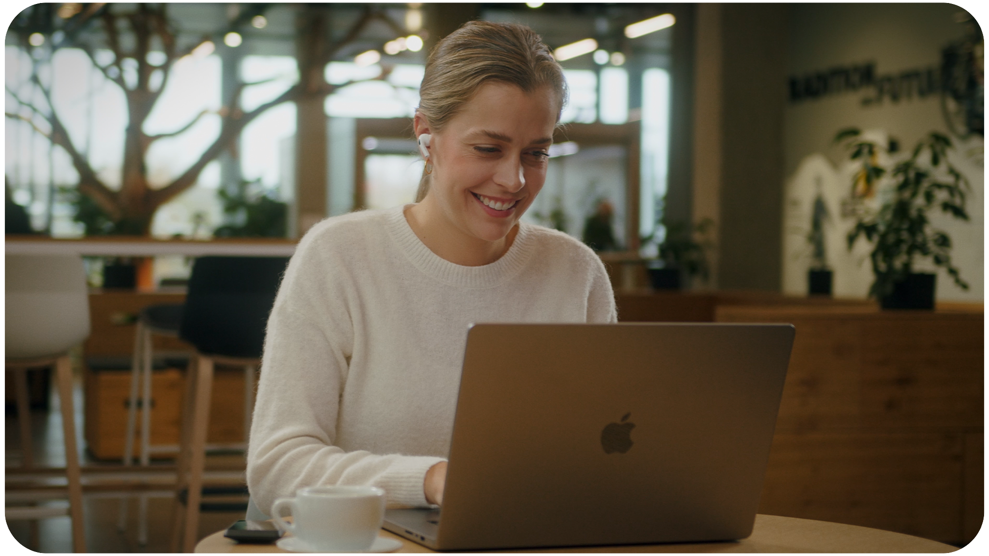 Vier junge Menschen sitzen auf einer Couch in einem modernen Raum mit großen Fenstern, einem grünen Pflanzenstück und einem hellen Teppich.